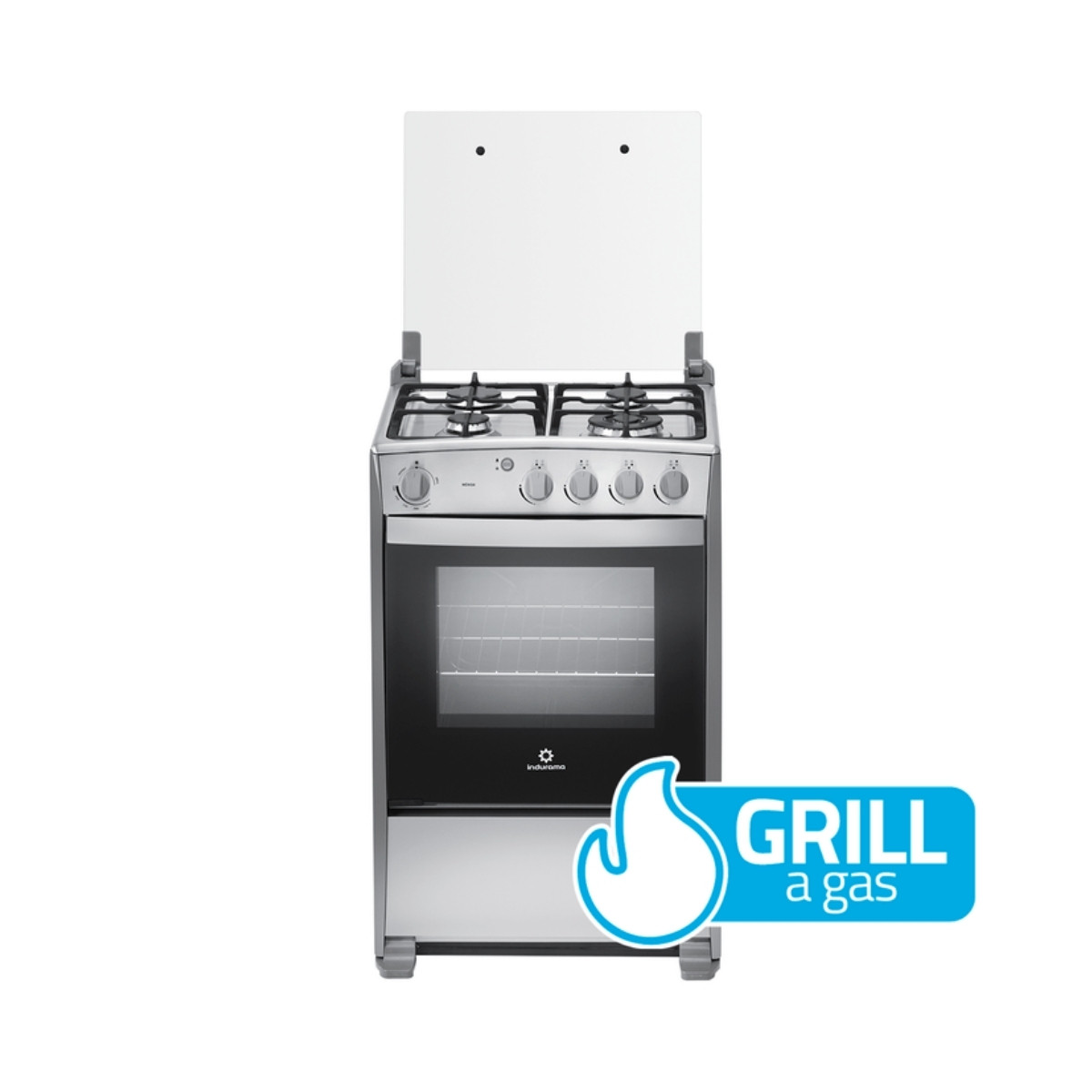 Cocina Indurama Mérida Quarzo Home de 4 quemadores con Triple Corona, grill a gas, doble vidrio templado y encendido electrónico. Diseño croma de 24”, compacta, eficiente y perfecta para hogares modernos.