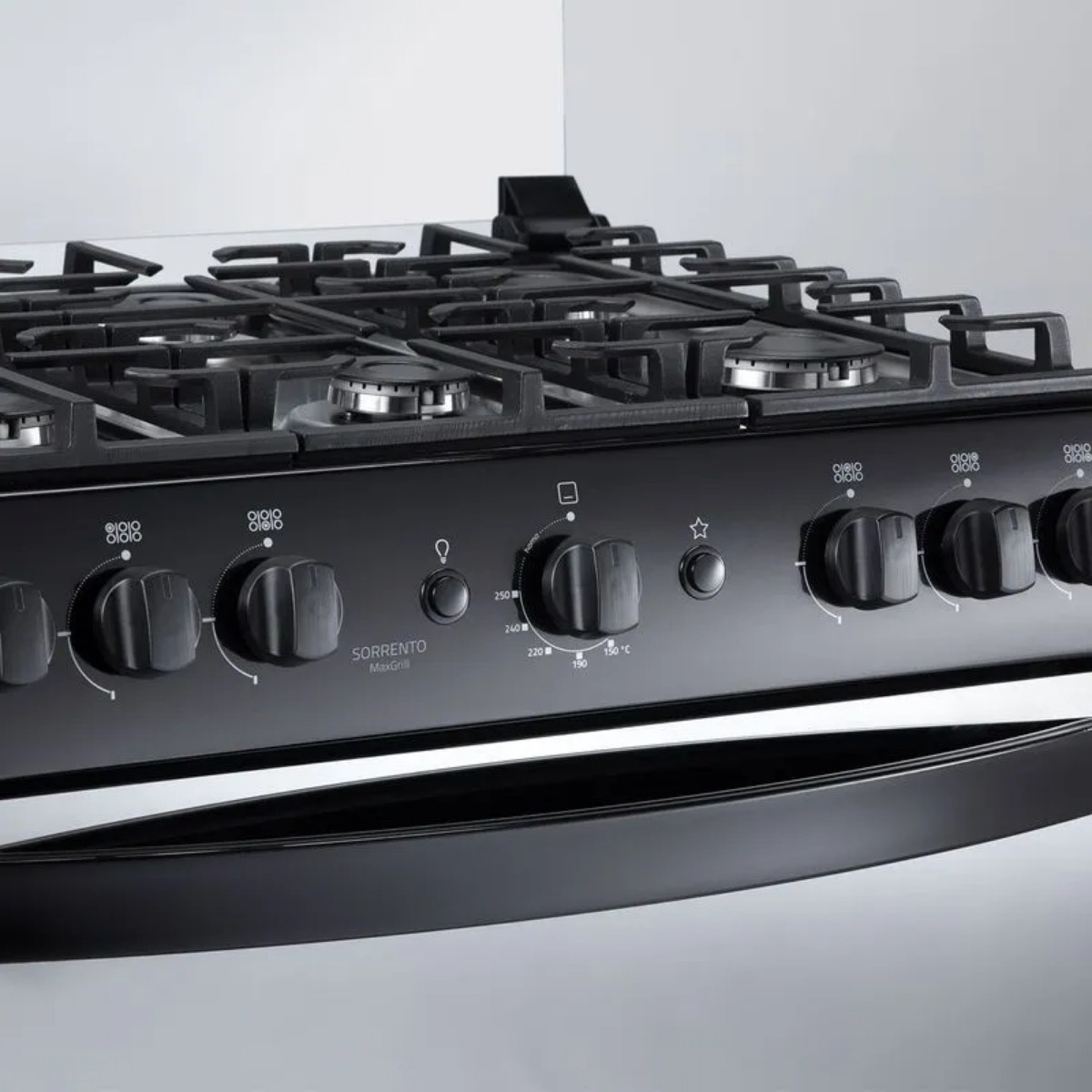 Cocina Sorrento Maxgrill Zafiro 30” con 6 quemadores sellados, grill a gas, TermoPrecisión y sistema corta-gas. Diseño negro con vidrio templado y ReallyClean. Amplia, segura y perfecta para hogar o emprendimientos.