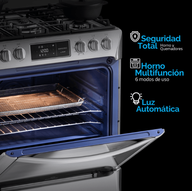La puerta panorámica de doble vidrio mantiene el calor dentro sin perder visibilidad, mientras que los sistemas de cortagas y apagado automático brindan seguridad en cada uso. Su plancha asadora de superficie mixta abre nuevas posibilidades para preparar carnes, vegetales y más con acabados profesionales.