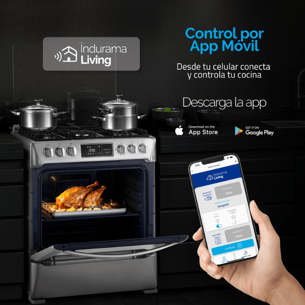 El verdadero toque inteligente llega con Indurama Living, la app que permite controlar la cocina desde el celular: activar el horno, ajustar temperaturas o encender la función AirFryer para lograr dorados crujientes en menos tiempo. Incluso puedes iniciar modos como turbo, grill a gas o autolimpieza ReallyClean mediante comandos de voz, dándote total libertad mientras cocinas.