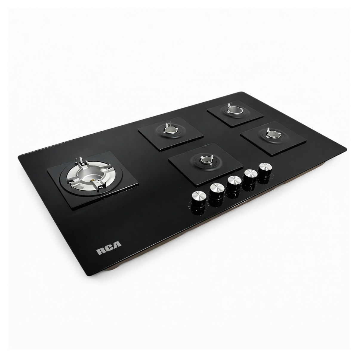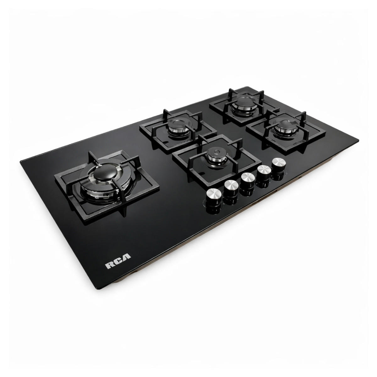 La Encimera a Gas RCA 90GP007 de 90 cm en color negro ofrece alto rendimiento y diseño moderno. Cuenta con 5 quemadores Sabaf, incluyendo Triple Corona, parrillas de hierro fundido, cubierta de vidrio templado y encendido eléctrico en perillas, ideal para una cocción potente, segura y elegante.
