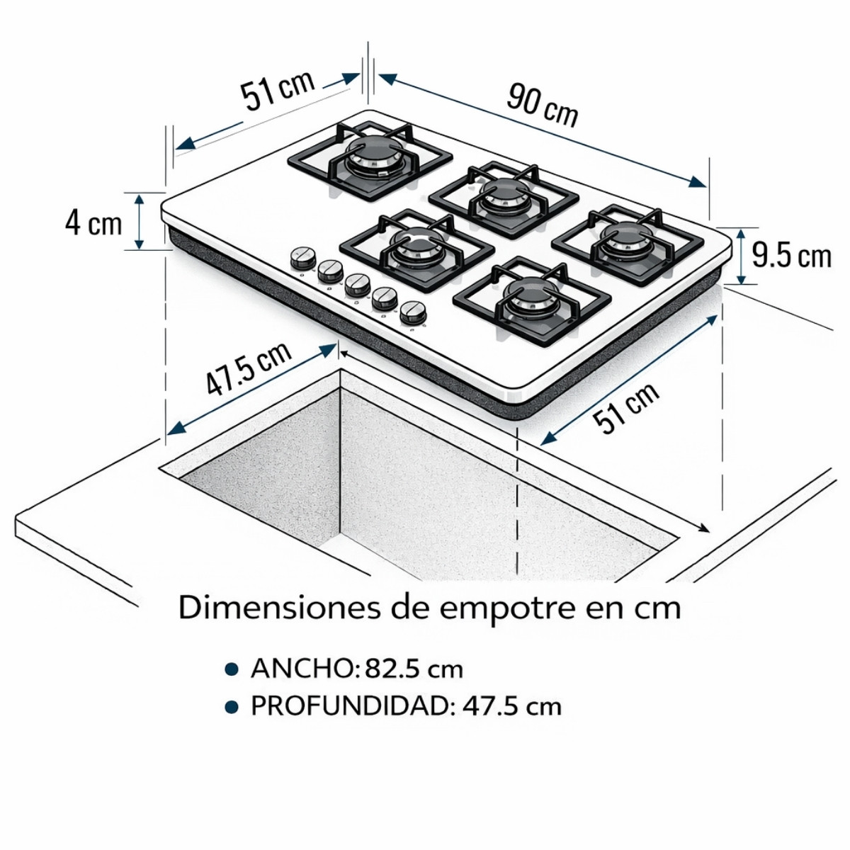 Con un ancho de 90 cm, esta encimera es perfecta para quienes necesitan espacio y versatilidad para cocinar varios platos al mismo tiempo, combinando eficiencia, estilo y funcionalidad en un solo producto.