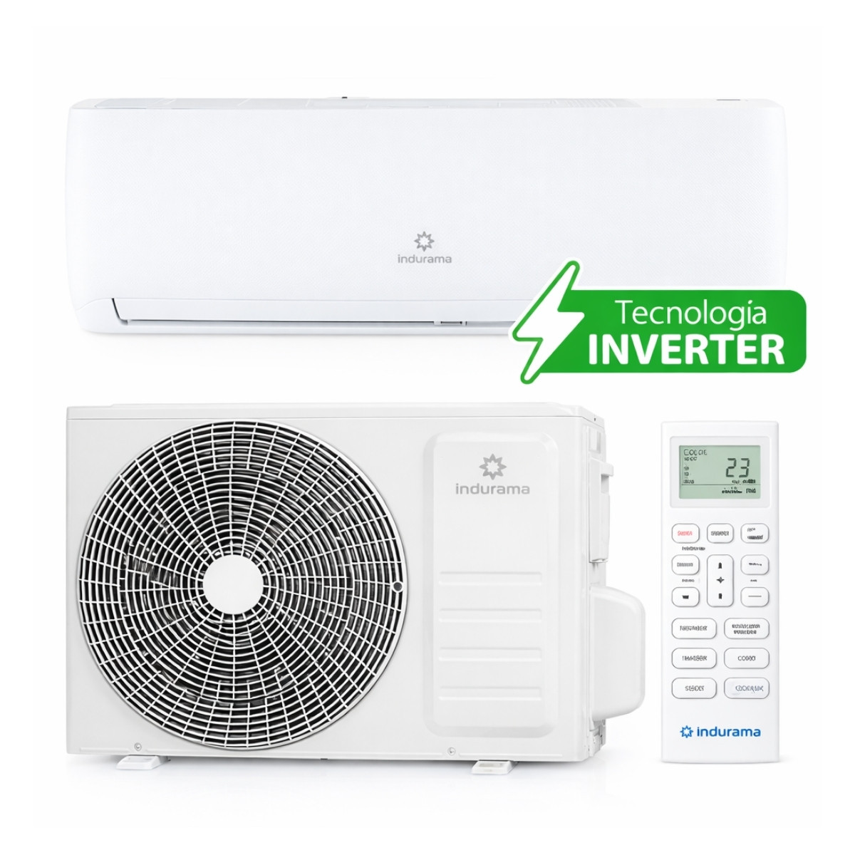 Aire acondicionado Indurama inverter 12.000 BTU con refrigerante R32, ahorro de hasta 65 % de energía y sistema Split con cañerías 100 % de cobre y protección Gold Fin. Incorpora filtro 4 en 1 que purifica el aire y modos inteligentes para mayor confort, silencio y eficiencia.
